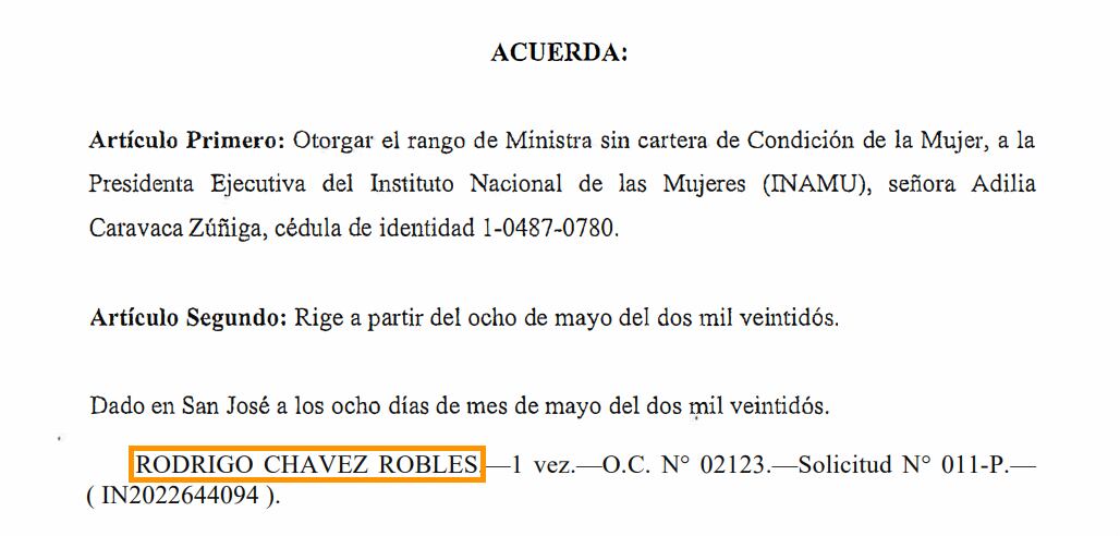 En los acuerdos publicados en La Gaceta, también se nombró por error a otra persona como ministra de la Condición de la Mujer.