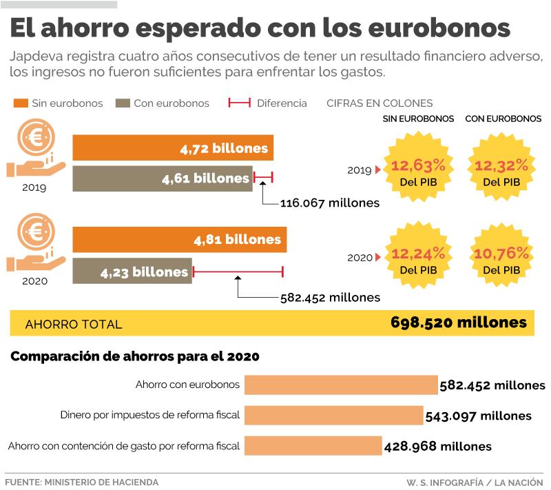 Mientras los tributos adicionales generarían unos ¢543.000 millones ese año, el plan de eurobonos reduciría en ¢582.000 millones el gasto en intereses y amortizaciones de la deuda pública.