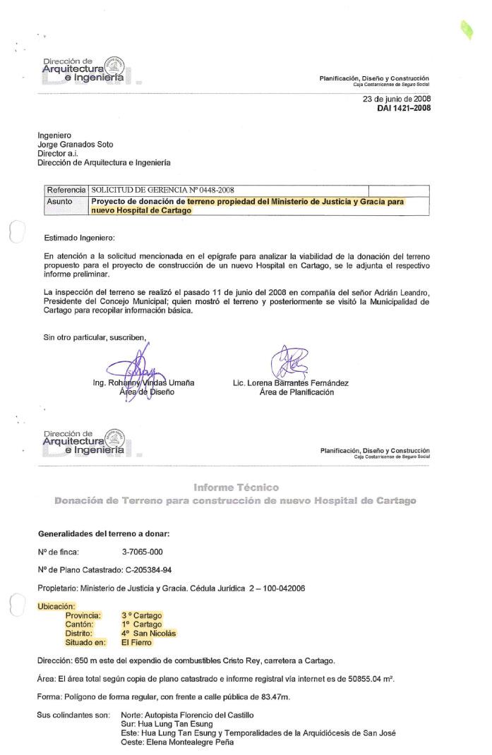 Esta mañana, Prensa de la CCSS corroboró que los análisis leídos por el mandatario hacen “referencia a un rechazo que se realizó por parte de la institución ante el ofrecimiento de donación de un terreno en el año 2008 para la construcción del Hospital de Cartago”.