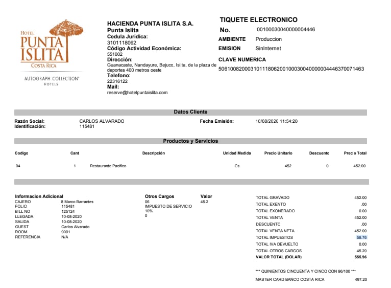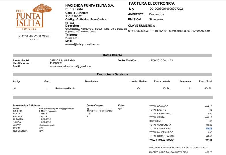 “Estamos de acuerdo, no son facturas electrónicas. Las facturas electrónicas son las que se emitieron el domingo en la noche, lunes en la mañana, que se enviaron al sistema de Tributación; las dos primeras son las que no le llegaron a don Carlos porque no teníamos el correo de él, eso fue error del hotel”, declaró el vocero del hotel.