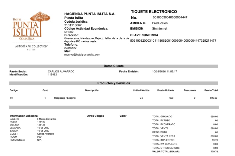 Hotel Punta Islita entregó a La Nación copias de los tiquetes electrónicos generados originalmente, las notas de crédito con las que se anularon dichos tiquetes y la versión final de las facturas, con fecha del 12 de agosto.