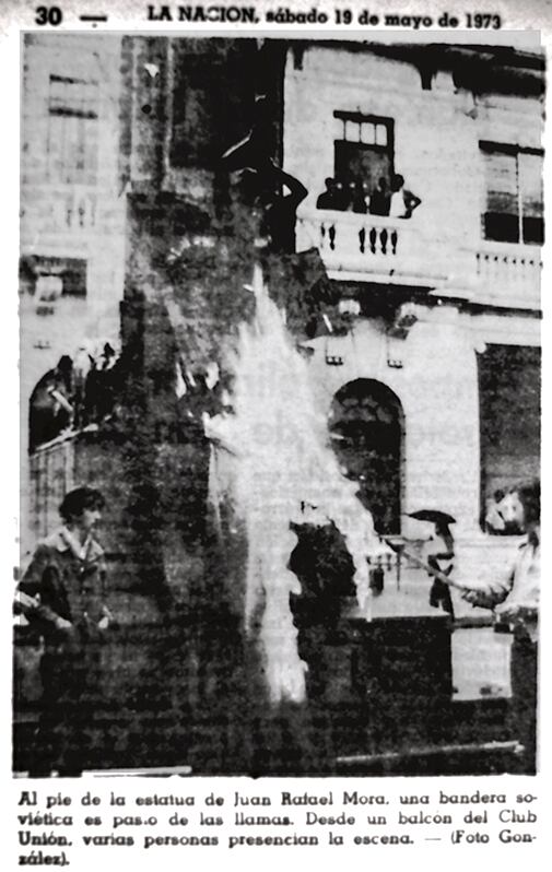 Al menos 100 activistas del movimiento Costa Rica Libre quemaron ayer a las 6. p. m. varias banderas soviéticas al pie de la estatua de Juan Rafael Mora, frente al edificio del Correo. Además, colocaron carteles en la estatua y pedían la expulsión de diplomáticos soviéticos que estaban en el país. Cuando se procedió a quemar una de las banderas, una persona trató de arrebatarla y fue golpeada por los manifestantes. Ensangrentada, fue introducida a un carro.