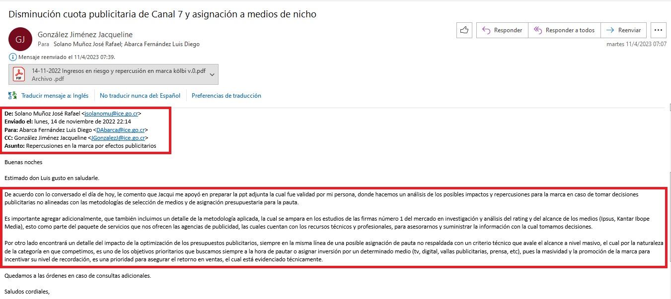 “Agradezco me brinden realimentación en cuanto a la solicitud realizada por la administración superior, de rebajar la pauta publicitaria a Canal 7 (Teletica) y trasladarle esa inversión a medios de menor alcance, así como lo de la asignación de pauta a medios de nicho sin el respaldo técnico respectivo”, escribió González Jiménez.
