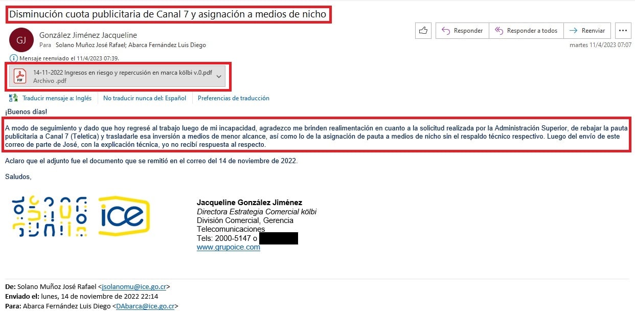 El 11 de abril anterior, casi ocho horas después de pedir información sobre la orden de reducir la inversión en publicidad en Canal 7, a las 3:05 p. m., el ICE comunicó a la entonces directora de Estrategia Comercial que no le renovaría su nombramiento en ese puesto –el cual ocupaba de manera interina– por un tema de confianza.