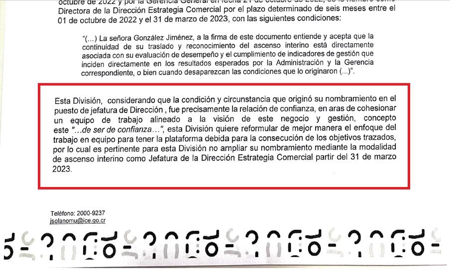 “En aras de cohesionar un equipo de trabajo alineado a la visión de este negocio y gestión, concepto este ‘...de ser de confianza...’, esta división quiere reformular de mejor manera el enfoque del trabajo en equipo para tener la plataforma debida para la consecución de los objetivos trazados, por lo cual es pertinente para esta División no ampliar su nombramiento mediante la modalidad de ascenso interno a partir del 31 de marzo del 2023″, escribió José Rafael Solano, jefe de la División Comercial.