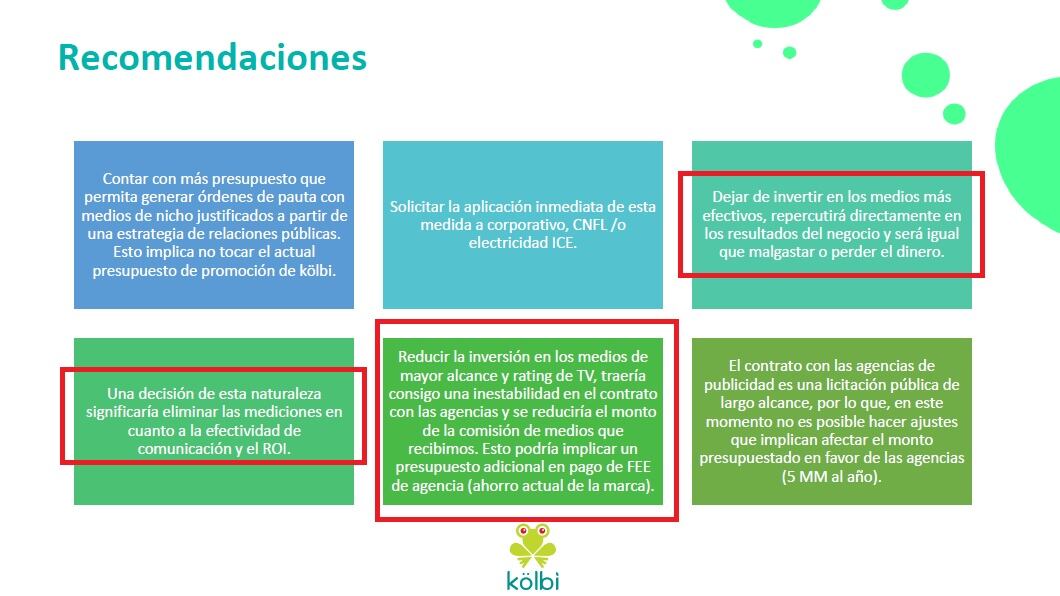 “Reducir la inversión en los medios de mayor alcance y rating, de TV, traería consigo una inestabilidad en el contrato con las agencias y se reduciría el monto de la comisión de medios que recibimos. Esto podría implicar un presupuesto adicional en pago de ‘fee’ (comisión) de agencia (ahorro actual de la marca)”.
