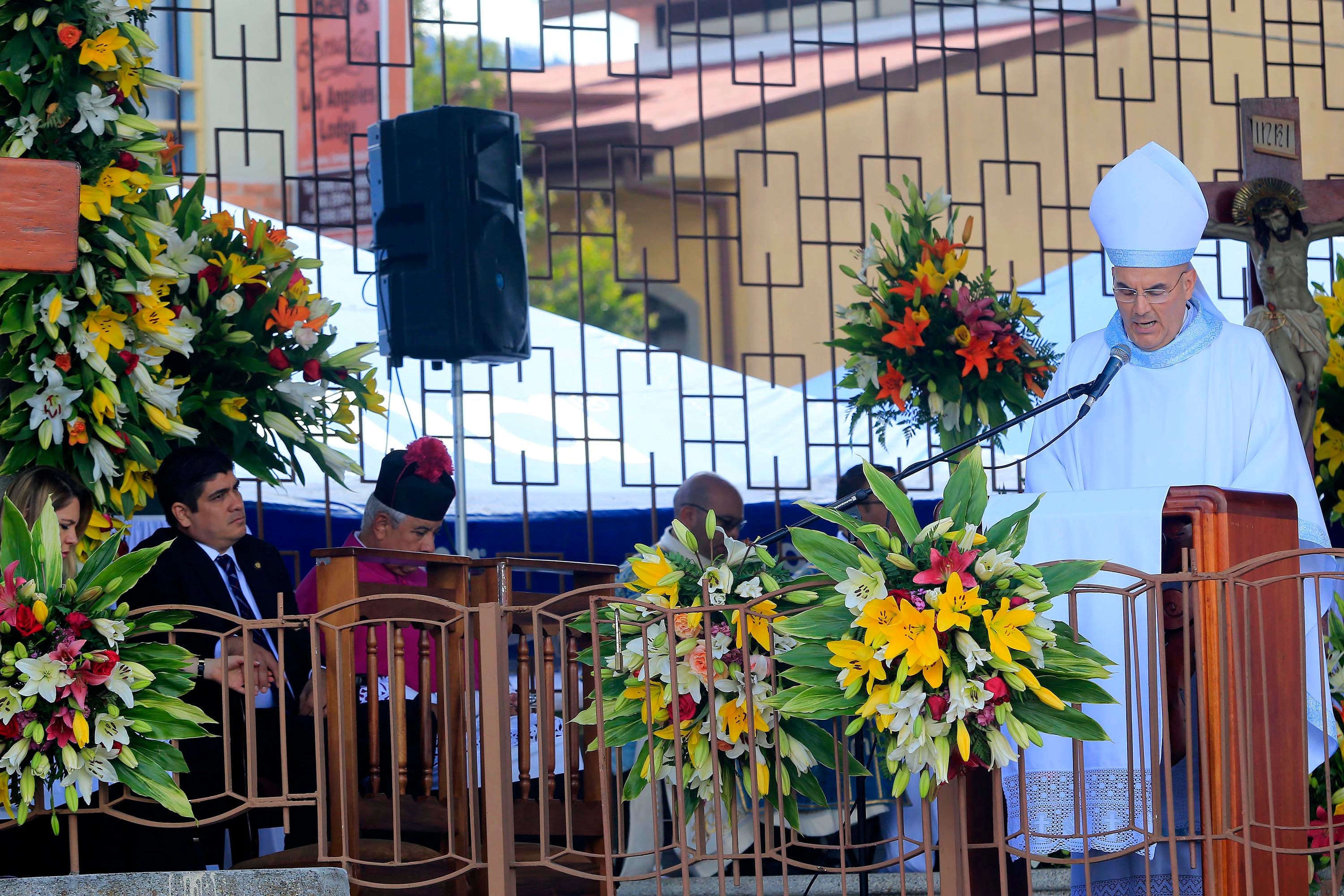El obispo de Ciudad Quesada, designado por la Conferencia Episcopal para dar el mensaje de la Iglesia durante la ceremonia que se efectuó en el templete de la basílica de los Ángeles, lanzó una homilía cargada de pronunciamientos políticos, dirigidos a los fieles, a las autoridades del gobierno y a los diputados del Congreso que acudieron a la ceremonia religiosa.