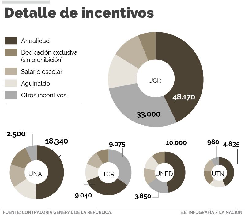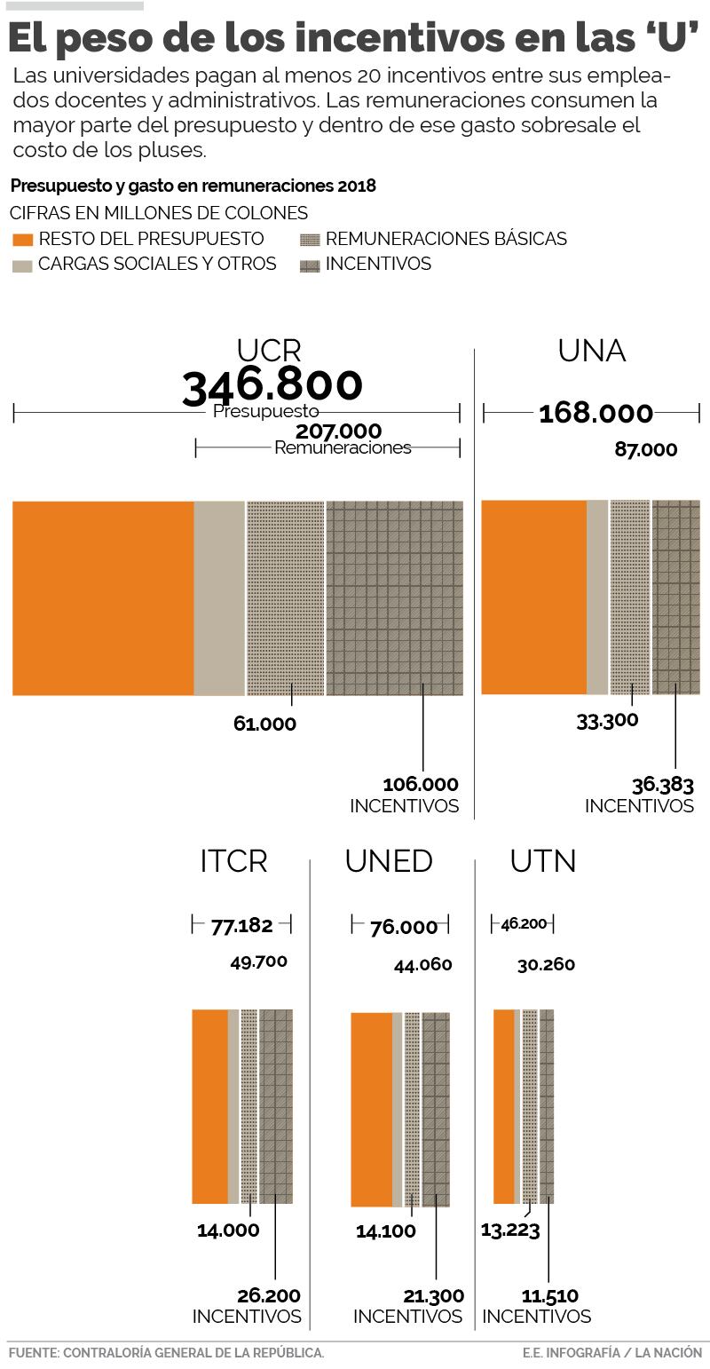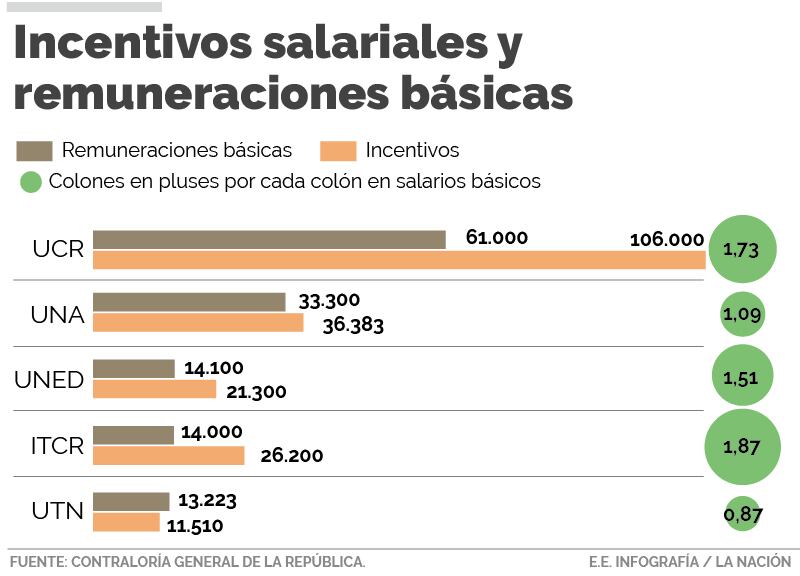 La relación entre salarios básicos e incentivos en las universidades es superior a la del Gobierno Central, donde se paga ¢1,04 de incentivos por cada ¢1 de salario base, de acuerdo con el último informe de Evolución Fiscal que elabora la Contraloría General de la República, cada año.