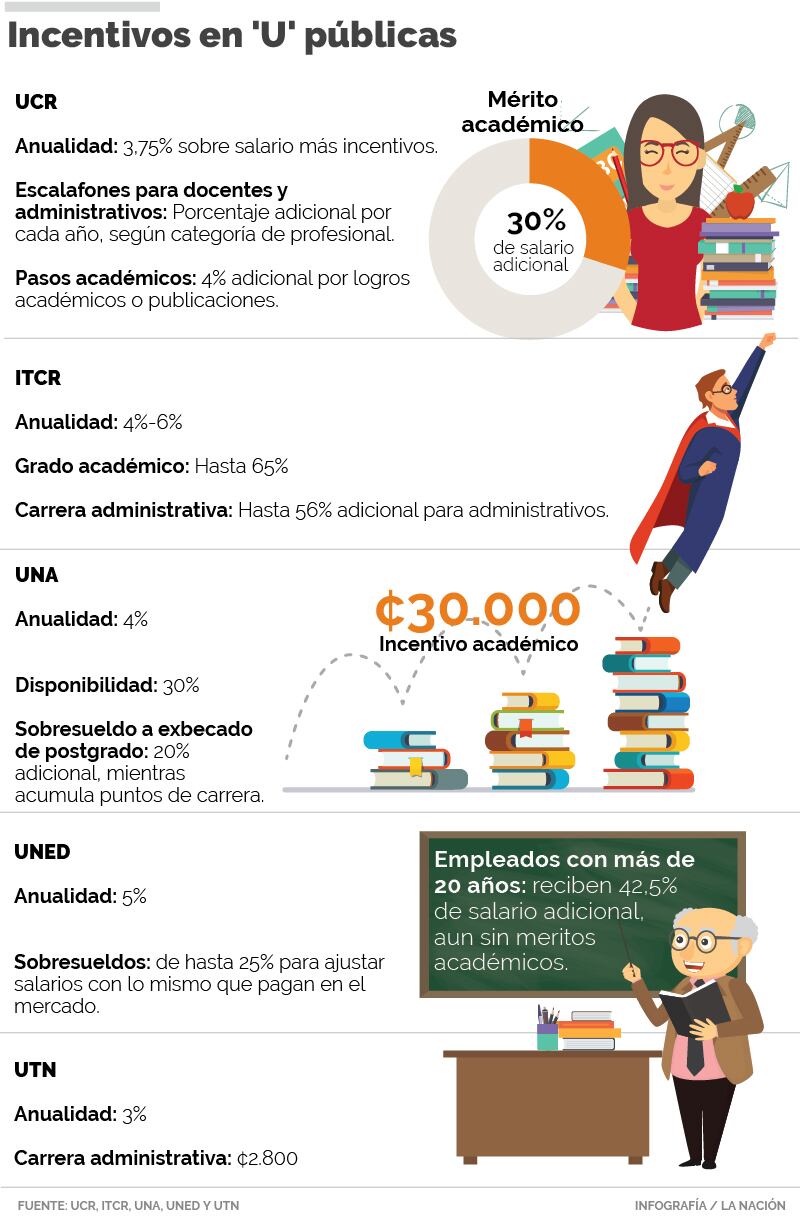 La masa salarial también se encarece por otros incentivos como los escalafones de la UCR y del ITCR que se otorgan a los empleados según su categoría o calificación. Estos incentivos reconocen la experiencia y la calidad académica.