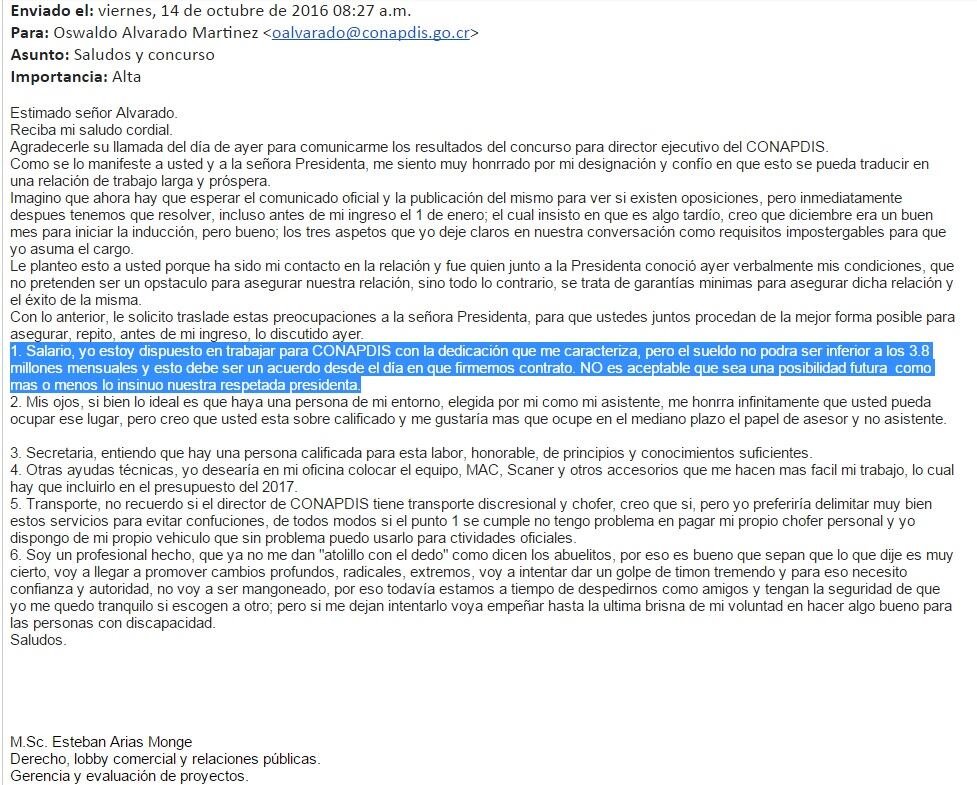 "Yo estoy dispuesto en trabajar para Conapdis con la dedicación que me caracteriza, pero el sueldo no podrá ser inferior a los ¢3,8 millones mensuales y esto debe ser un acuerdo desde el día en que firmemos contrato. NO (mayúsculas son del original) es aceptable que sea una posibilidad futura como más o menos lo insinuó nuestra respetada presidenta", se lee en el correo electrónico que dirigió Arias al Conapdis el 14 de octubre pasado.
