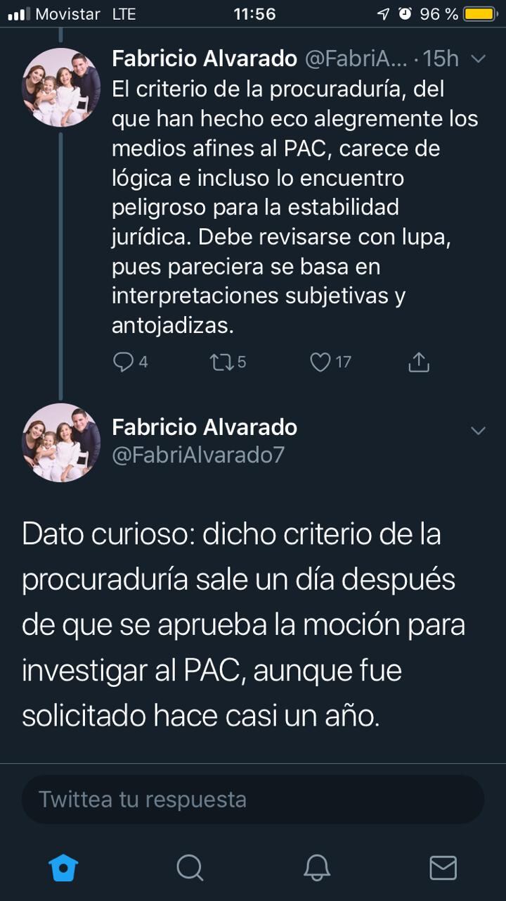 “¿Qué es lo más problemático y lo más sensible de todo esto? Es el hecho de que el gobierno del PAC siga haciendo de las suyas. El abogado del gobierno del PAC es la Procuraduría y este criterio lo hacen llegar a la Asamblea, manifestando que hay ilegalidad en un pago, pocas horas después de que un diputado vota a favor de investigar al PAC, como parte de sus campañas electorales", arguyó el congresista.