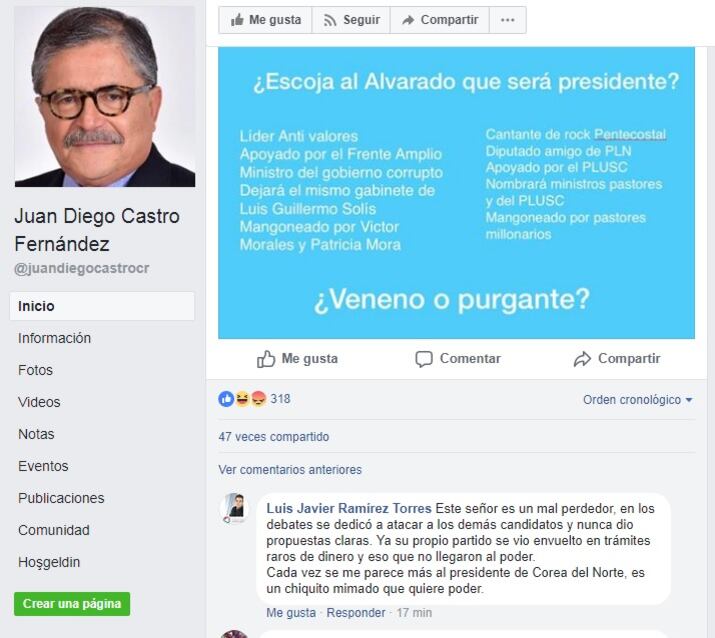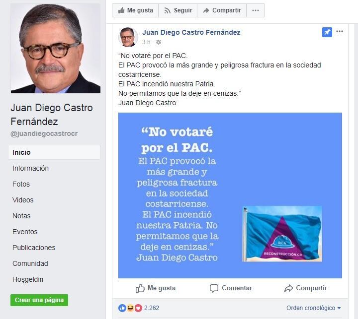"No votaré por el PAC. El PAC provocó la más grande y peligrosa fractura en la sociedad costarricense. El PAC incendió nuestra Patria. No permitamos que la deje en cenizas", dice Juan Diego Castro en su página de Facebook.