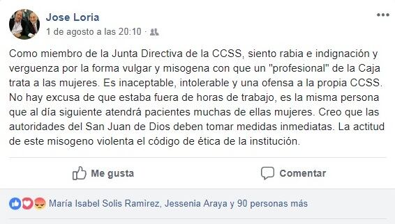 “Como miembro de la Junta Directiva de la CCSS, siento rabia, indignación y vergüenza por la forma vulgar y misógina con que un ‘profesional’ de la Caja trata a las mujeres. Es inaceptable, intolerable y una ofensa a la propia CCSS”, expresó Loría.