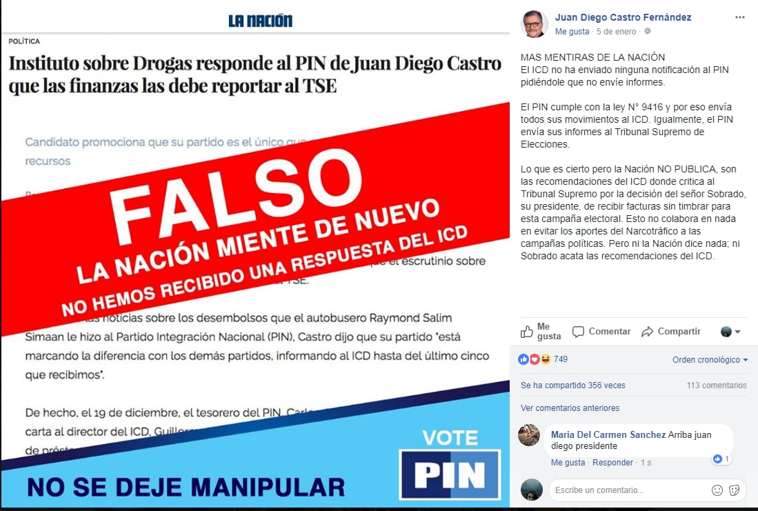 "Somos los únicos que le pedimos al ICD que recibiera nuestros reportes para que supiera quiénes nos daban los dineros en nuestros bonos o en eventuales donaciones. ¿Será que ahora los señores del PAC o de La Nación están preocupados porque estamos marcando la diferencia con esos partidos, informando al ICD?", expresó el candidato del PIN el 3 de enero.