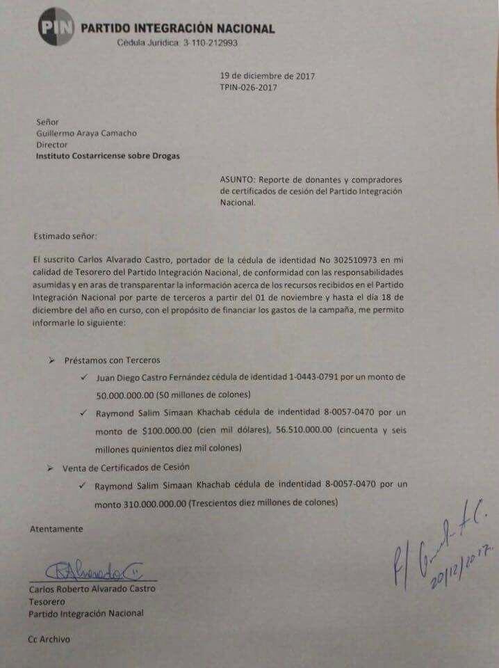 "La nota entregada por Alvarado (tesorero del PIN), donde se detalla los donantes del partido, fue recibida previo al receso de fin de año. Al regreso de laboress será reenviada al TSE y se le responderá vía oficio a Alvarado indicando de nuevo que esta información debe ser remitida al Tribunal", dice la respuesta enviada a este medio por el Gobierno a principios de año.