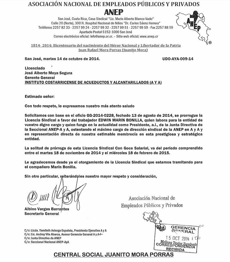 AyA entregó hoy a este diario los permisos con goce de salario para Marín, cuyas solicitudes siempre han sido firmadas por Albino Vargas.