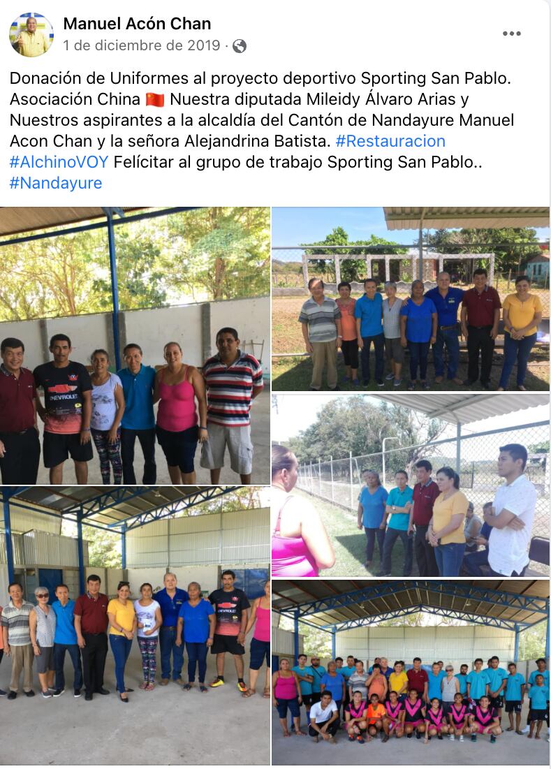 En una de las conversaciones intervenidas, el candidato a diputado por Guanacaste asegura que la “comunidad china” lo nombró “asesor”. Asimismo, en sus publicaciones en Facebook se puede apreciar que algunos grupos empresariales de origen asiático lo acompañaron en varias actividades. Tal es el caso de una entrega de uniformes a un equipo deportivo de una comunidad de Nandayure, cuando era candidato a alcalde. En esa actividad, también participó la diputada Mileidy Alvarado.