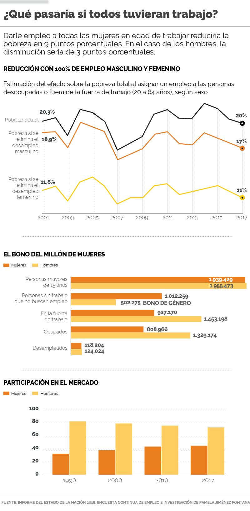 De hecho, según estimaciones incluidas en el informe del Estado de la Nación del 2018, si todas las mujeres que están sin trabajar consiguieran un empleo, la pobreza podría reducirse de un 20% a un 11%. En cambio, si ocurriera lo mismo con los hombres, la disminución sería de tres puntos porcentuales.