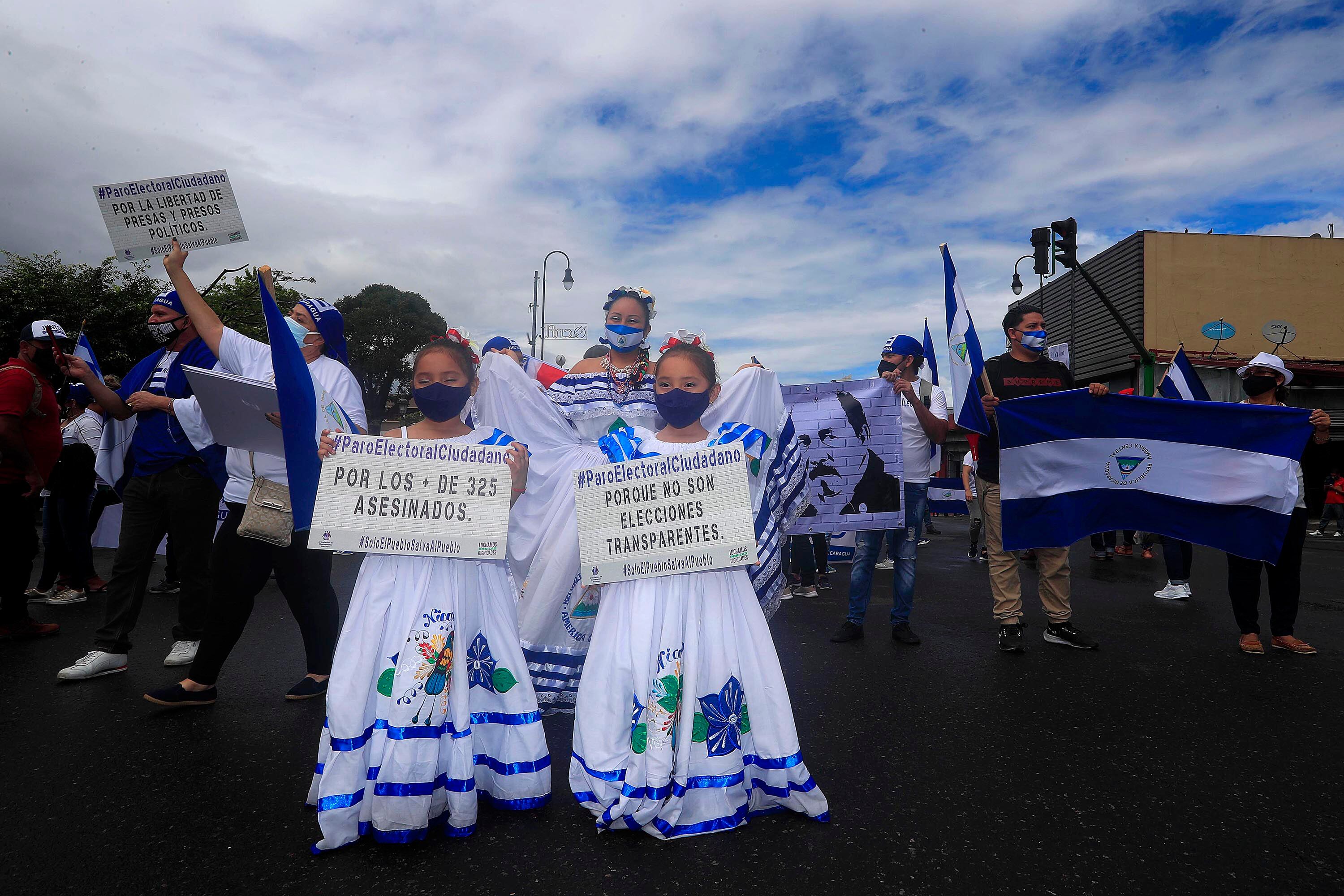 Nicaragüenses radicados en Costa Rica protestaron este domingo, en San José, contra la “farsa electoral” que montaron Daniel Ortega y su esposa Rosario Murillo para obtener un nuevo periodo presidencial de cinco años, con lo cual sumarán 30 años en el poder en Nicaragua.