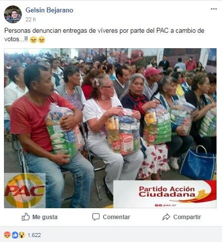 Una fotografía falsa, en la que aparecen varios adultos mayores con víveres, se está utilizando en redes sociales para afirmar que el Partido Acción Ciudadana (PAC) está cambiando alimentos por votos.