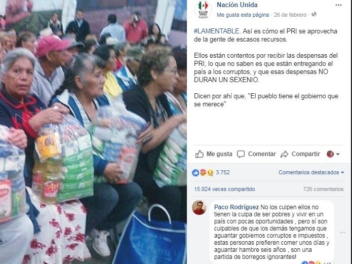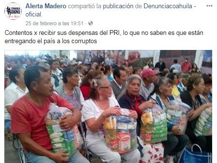 "Ellos están contentos por recibir las despensas del PRI, lo que no saben es que están entregando el país a los corruptos, y que esas despensas no duran un sexenio," expresa una de las publicaciones falsas.