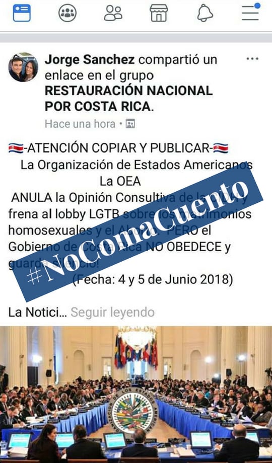 Una publicación falsa, que circula en redes sociales, afirma que la Organización de los Estados Americanos (OEA) anuló la opinión consultiva, solicitada por Costa Rica a la Corte Interamericana de Derechos Humanos (Corte IDH), sobre matrimonio igualitario e identidad de género.
