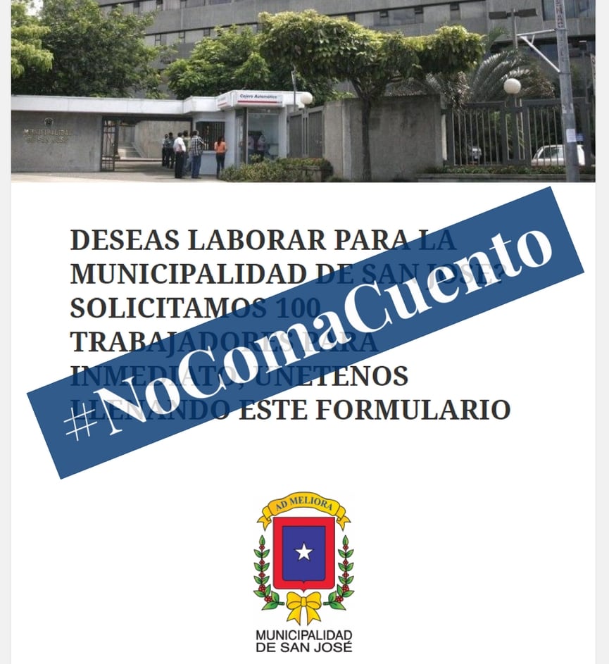 Una oferta falsa de 100 empleos en la Municipalidad de San José se está compartiendo en redes sociales.