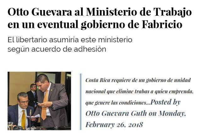 Por su parte, Otto Guevara también negó cualquier tipo de ofrecimiento por parte del postulante de Restauración Nacional, como recompensa por el respaldo público que le dio el pasado 26 de febrero por medio de una publicación en su página de Facebook.