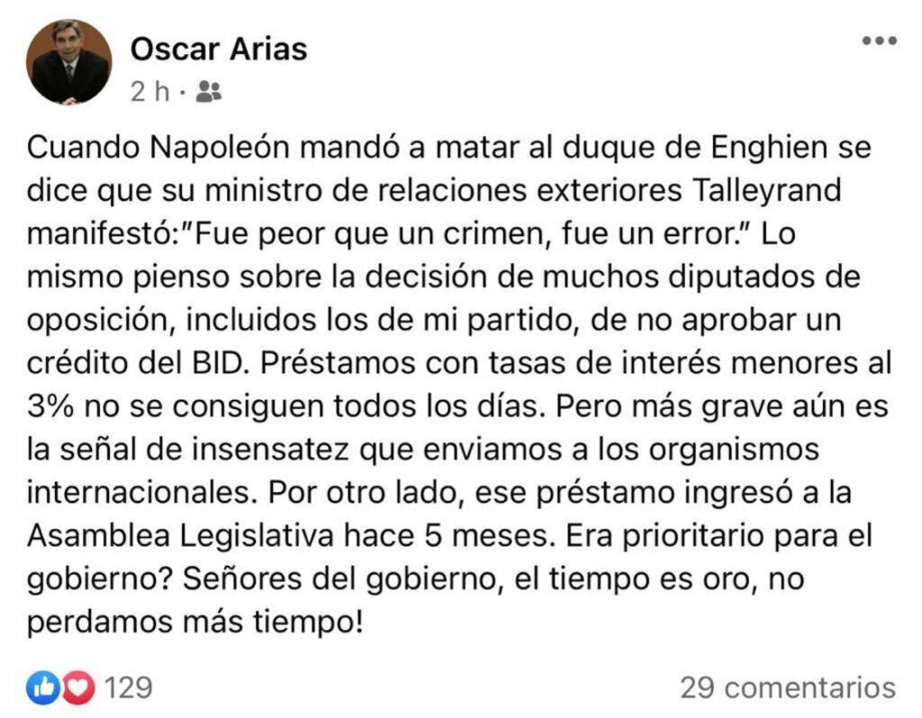 En un comentario publicado en su perfil de Facebook, Arias deploró lo que hicieron los legisladores opositores, incluidos los del Partido Liberación Nacional (PLN), de dejar que se perdiera un préstamo cuya tasa de interés iba a ser del 2,8%, pues enfatizó que ese tipo de financiamiento no se consigue todos los días.