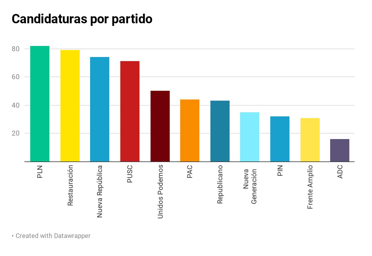 El único partido que participa con candidatos en las 82 alcaldías es Liberación Nacional (PLN); le siguen el Partido Restauración Nacional, con 79; Nueva República con 74; y el Partido Unidad Social Cristiano (PUSC) con 71.