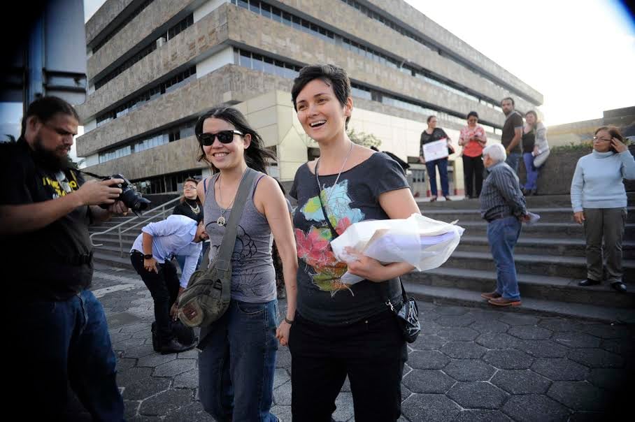 Jazmín Elizondo y Laura Flórez-Estrada recibieron apoyo al salir de la Sala Constitucional, este jueves, tras presentar una acción contra el Código de Familia. (Diana Méndez )