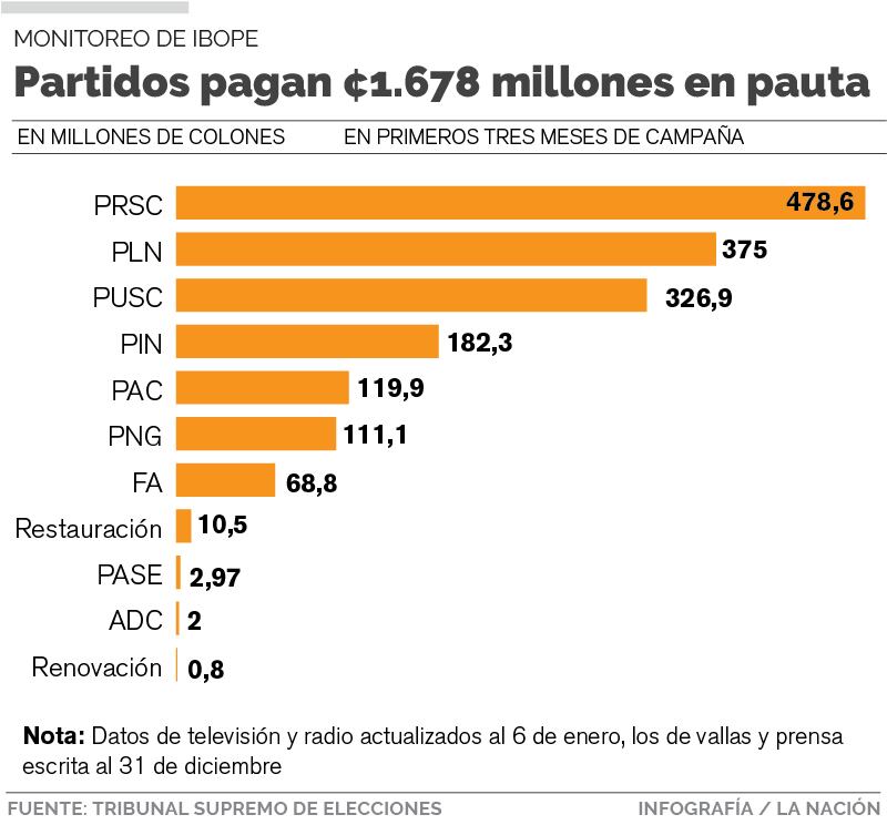Acción Ciudadana puso ¢86,1 millones en TV, ¢17,2 millones en vallas y ¢14,6 millones en radio y ¢1,8 millones en prensa escrita; mientras que el PLN pagó ¢281,3 millones por anuncios en canales de televisión, ¢88,7 millones por vallas, ¢3,3 millones por cuñas de radio y ¢5,5 por piezas en periódicos.