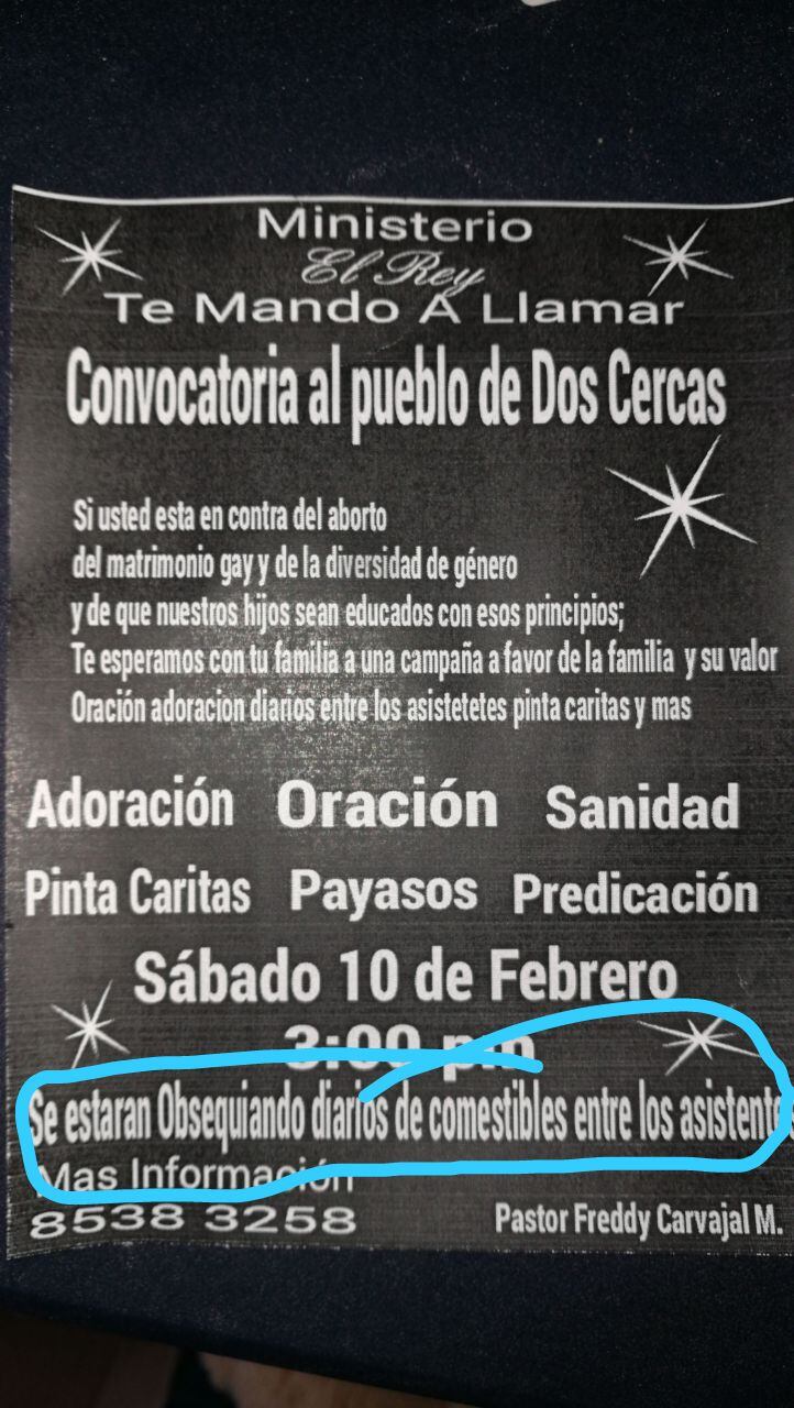 En un pequeño parque, en la comunidad de Dos Cercas, en Desamparados, el pastor evangélico Freddy Carvajal convocó al público a una actividad pública en contra de la "diversidad de género", del aborto y de las guías de educación sexual del Ministerio de Educación Pública (MEP).