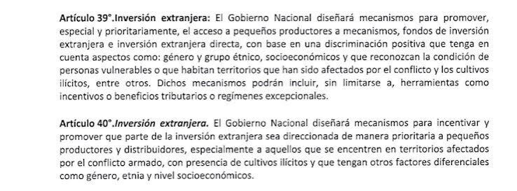 Textualmente, dice: “El Ministerio de Comercio Exterior a través de PROCOMER diseñará mecanismos para promover, especial y prioritariamente, el acceso a pequeños productores a mecanismos, fondos de inversión extranjera e inversión extranjera directa, con base en una discriminación positiva que tenga en cuenta aspectos como: género y grupo étnico, socioeconómicos y que reconozcan la condición de personas vulnerables o que habitan territorios que han sido afectados por el conflicto y los cultivos ilícitos, entre otros”.