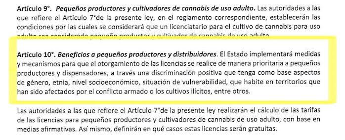 El artículo 42 del plan de ley para Costa Rica, el cual alude beneficios a pequeños productores y distribuidores, dice textualmente: “El Estado implementará medidas y mecanismos para que el otorgamiento de las licencias se realice de manera prioritaria a pequeños productores y dispensadores, a través una discriminación positiva que tenga como base aspectos de género, etnia, nivel socioeconómico, situación de vulnerabilidad, que habite en territorios que han sido afectados por el conflicto armado o los cultivos ilícitos, entre otros”.
