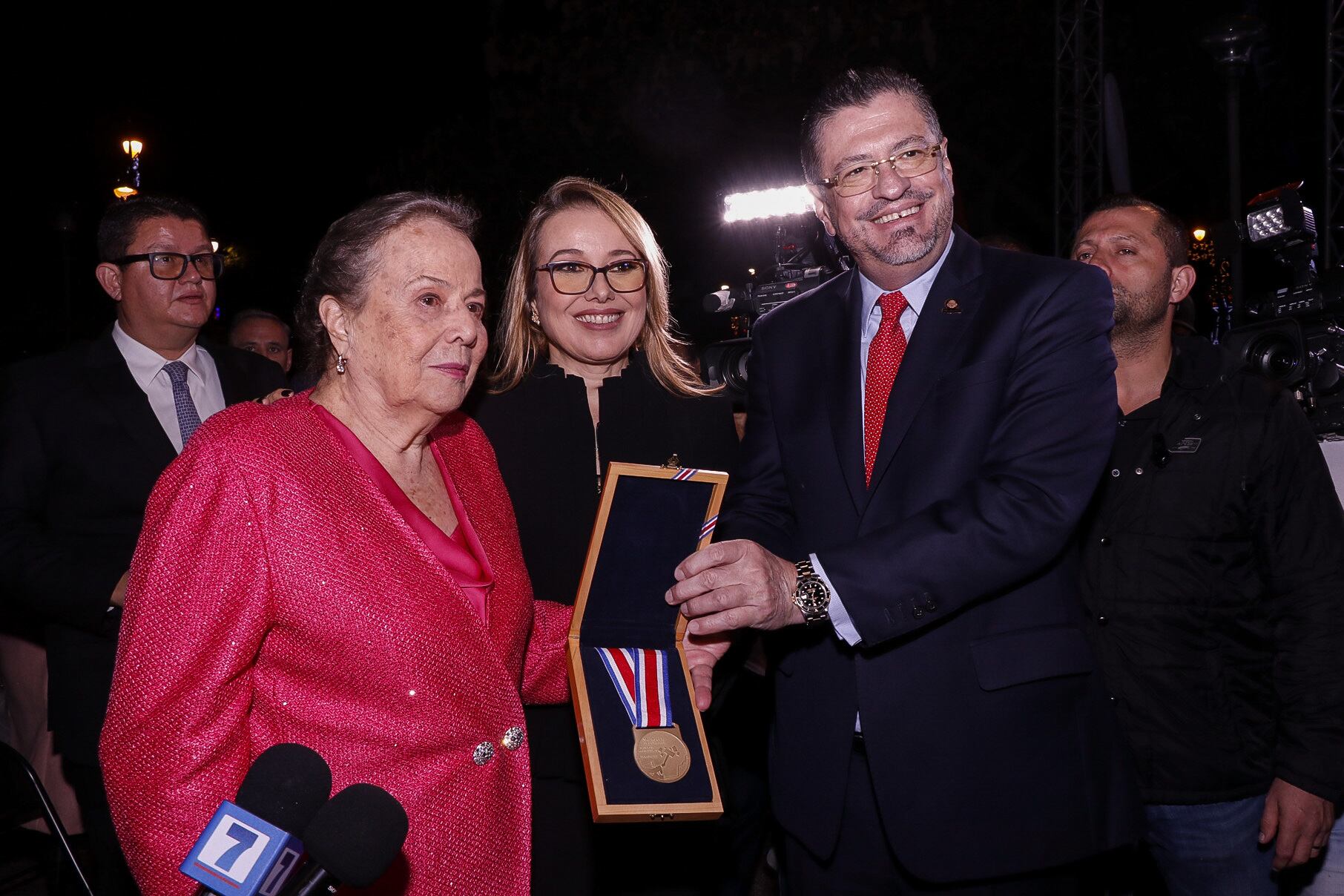 Al condecorar esta noche a Olga Cozza, presidenta de Teletica, el mandatario Rodrigo Chaves declaró que ella y su esposo fundaron uno de los pilares de la democracia, el cual contribuyó a las libertades de prensa y de expresión.