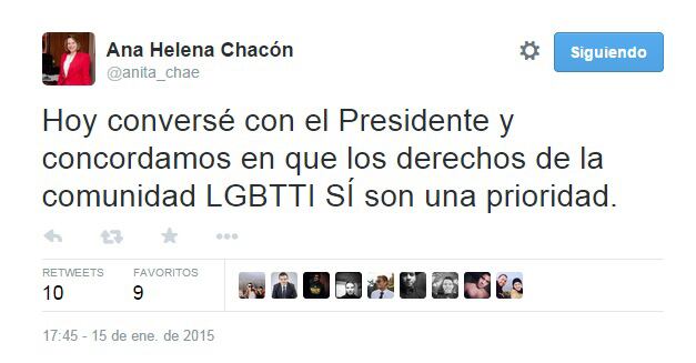 “Hoy (miércoles de la semana anterior) conversé con el presidente y concordamos en que los derechos de la comunidad LGBTTI (lesbianas, gais, bisexuales, transgénero, transexual e intersexo) sí son una prioridad. Por esa razón vamos a convocar un proyecto sobre derechos de parejas del mismo sexo en el momento más oportuno de estas extraordinarias”, aseveró Chacón.