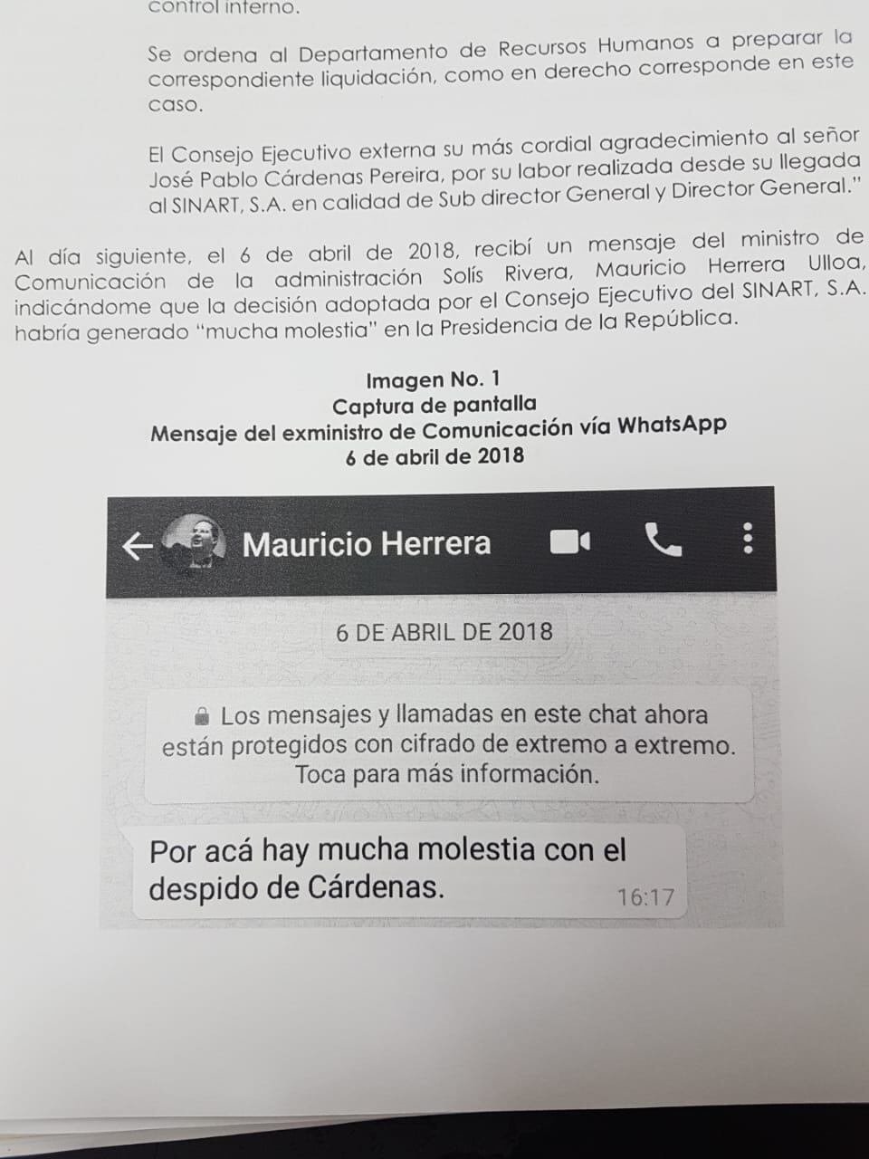 El 6 de abril, Mauricio Herrera le envió un mensaje por WhatsApp a Mario Alfaro en el que le expresó el malestar del Poder Ejecutivo por la salida de Cárdenas del Sinart.