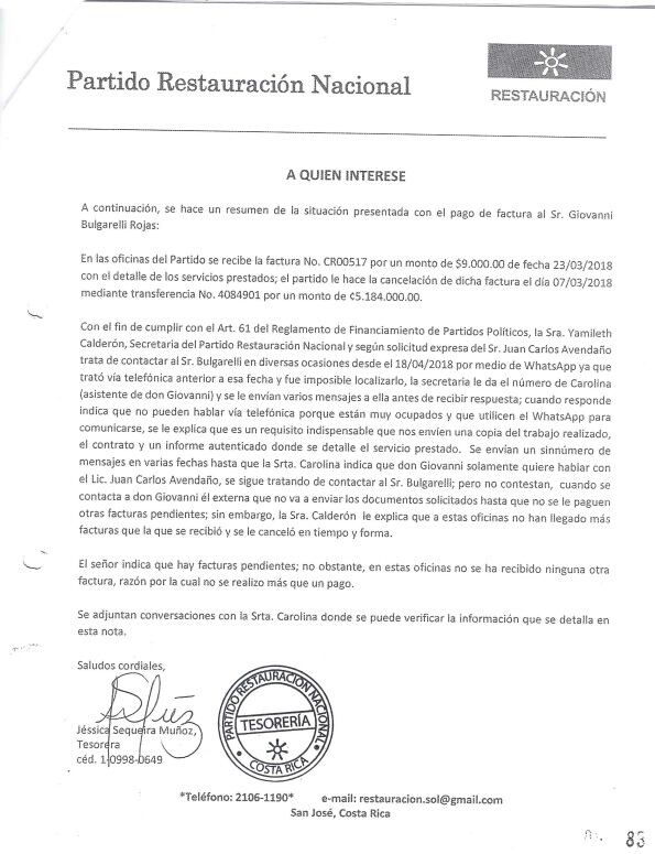 “(...) Cuando se contacta a don Giovanni él externa que no va a enviar los documentos solicitados hasta que no se le paguen otras facturas pendientes; sin embargo, la Sra. (Yamileth) Calderón (secretaria del partido) le explica que a estas oficinas no han llegado más que la que se recibió y se le canceló en tiempo y forma”, redactó Sequeira en la nota enviada al TSE.