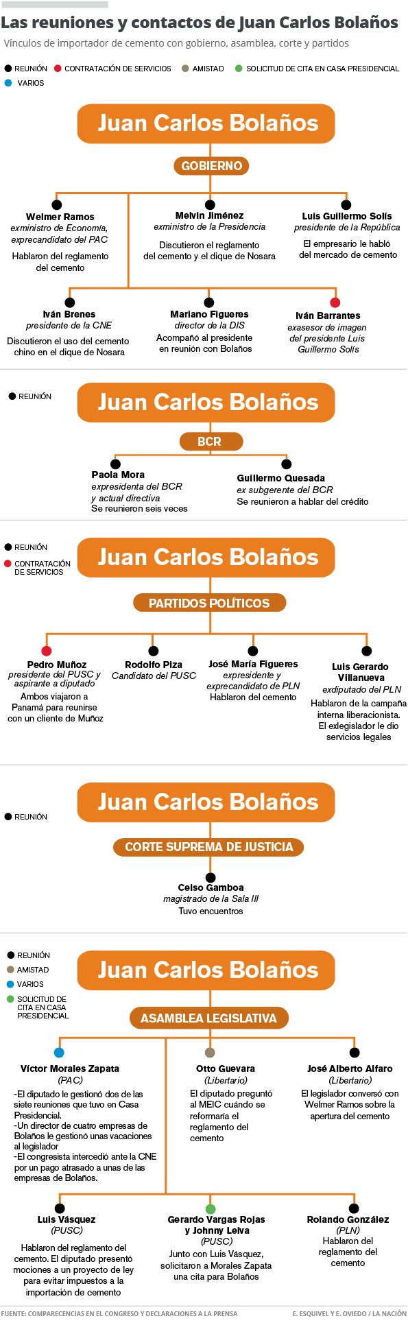 Mientras, a Leiva y Vásquez se le achaca haberle solicitado a Víctor Morales Zapata, diputado del Partido Acción Ciudadana (PAC), que coordinara una reunión para Juan Carlos Bolaños.