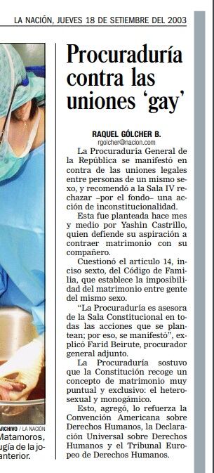 En julio del 2003, el abogado Yashin Castrillo interpuso una acción de inconstitucionalidad contra el inciso 6 del artículo 14 del Código de Familia, luego de que el Juzgado de Familia de Alajuela rechazara la solicitud que hizo para casarse con un hombre.