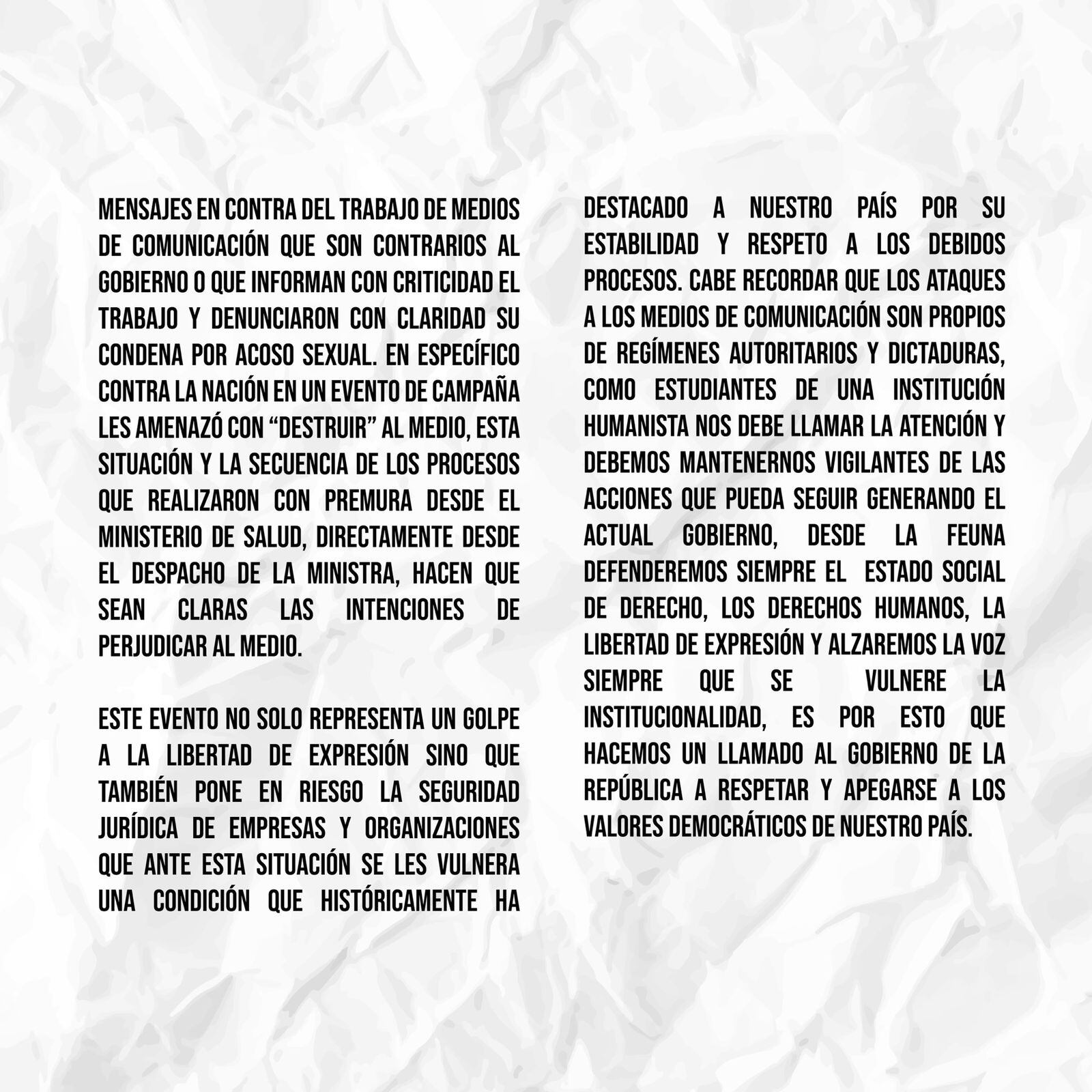 La Feuna también explicó que, pese a que no apoyan la línea editorial de La Nación por lo que ellos califican como críticas y reportajes malintencionados contra las universidades estatales y el sector público, se oponen al ataque de Chaves y llaman al Gobierno a cumplir con la democracia.