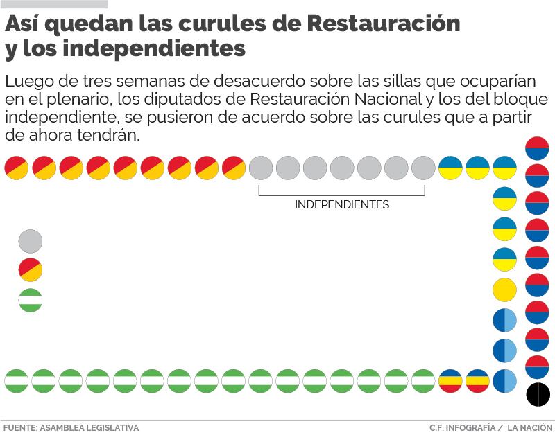 El desacuerdo entre el Partido Restauración Nacional y los diputados del bloque independiente por las curules en que se sentarán el resto de la legislatura concluyó este miércoles, luego de que llegaron a un arreglo para repartirse los espacios.