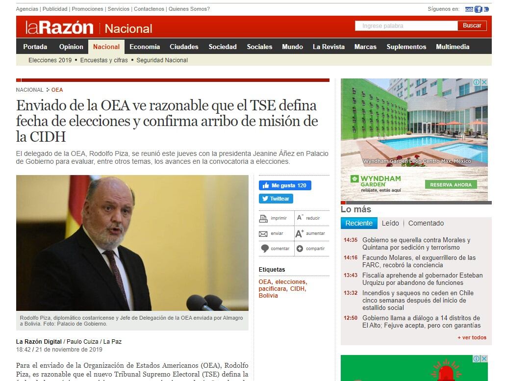 El exministro de la Presidencia, Rodolfo Piza, llegó esta semana a Bolivia como jefe de la misión de la Organización de Estados Americanos (OEA) que colabora en resolver la crisis política de ese país, agudizada tras la renuncia del expresidente Evo Morales el pasado 10 de noviembre.
