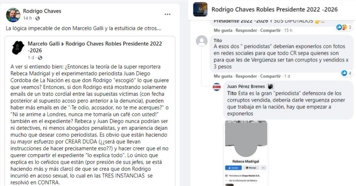 El candidato presidencial Rodrigo Chaves desaprobó el ataque surgido en contra de la periodista de La Nación Rebeca Madrigal, y de su familia, en una página de seguidores del político en Facebook, pero agradeció el apoyo en su favor.