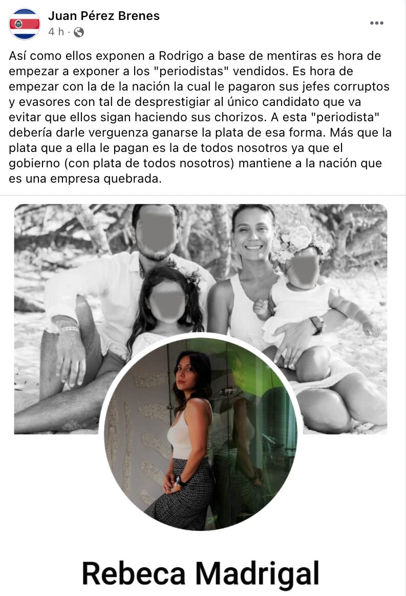 Así reaccionó Chaves luego de que, en el perfil Rodrigo Chaves Robles Presidente 2022-2026, un usuario denominado Juan Pérez Brenes publicó la fotografía de las dos hijas menores de edad de la periodista, junto con ella y su esposo, bajo el argumento de que era necesario exponerla.