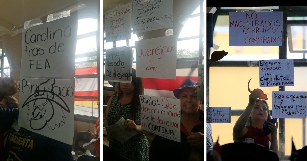 Grupos de sindicalistas que llegan a la barra de público, en el plenario del Congreso, están colocando letreros con insultos dirigidos a las diputadas en los ventanales del salón.