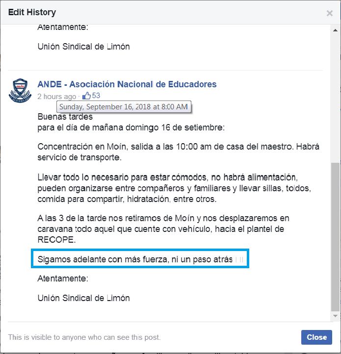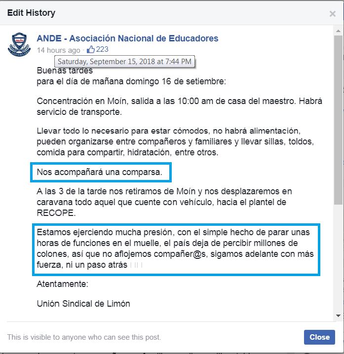 Y, este domingo, a las 8 a. m., alguien cambió la publicación del sindicato, eliminando el párrafo en que se hablaba de que logran que “el país deje de percibir millones de colones” y suprimiendo también el aviso de que habría comparsa.