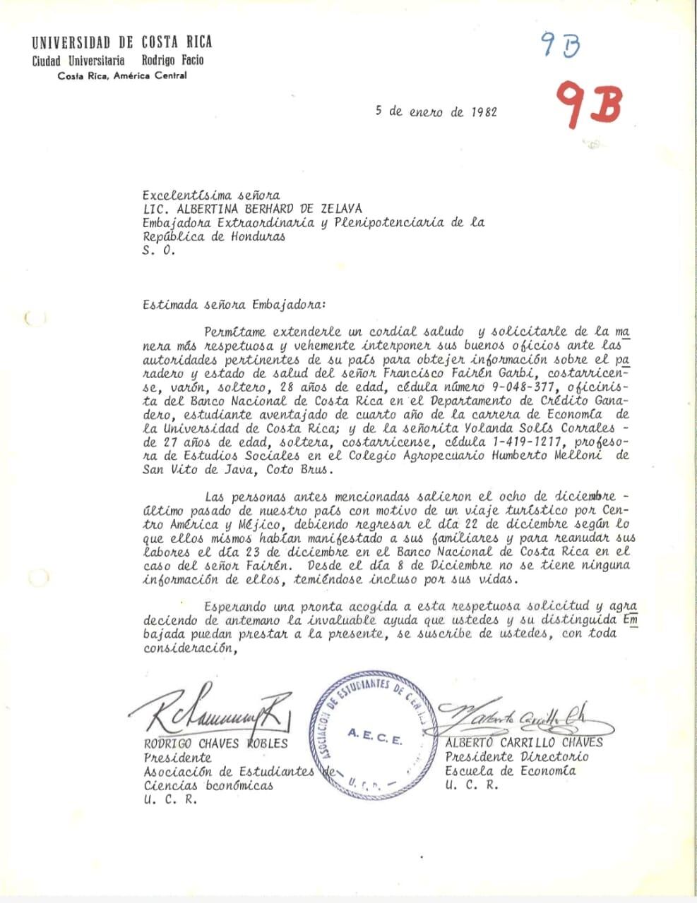 Chaves envió una misiva, el 5 de enero de 1982, a la entonces embajadora de Honduras, Albertina Bernhard de Zelaya, solicitándole información sobre ambos costarricenses.