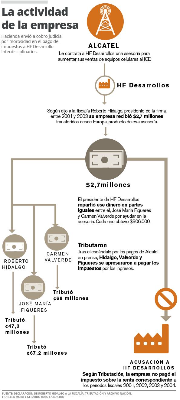 Tanto Hidalgo, como Figueres y Valverde presentaron declaraciones de impuestos después de que se revelara la consultoría que hicieron para Alcatel. En noviembre 2004 entre los tres pagaron un total de ¢182.5 millones.